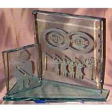 ESTRUTURA (25X31X16CM) FORMADA POR DUAS PLACAS DE VIDRO, SOBRE BASE DE MESMO MATERIAL. A PLACA MAIOR TRAZ GRAVADOS, EM JATO DE AREIA, QUATRO FIGURAS HUMANAS DE MÃOS DADAS, A LOGOMARCA DA VOLKSWAGEN E DO 'SINDICATO DOS METALÚRGICOS DO ABC / FILIADO À CUT' E A LOGOMARCA DA 'COMISSÃO DE FÁBRICA DOS TRABALHADORES NA VOLKS / METALÚRGICOS DO ABC CUT'. A PLACA MENOR TRAZ GRAVADO, EM JATO DE AREIA, A CARICATURA DO PRESIDENTE LULA. NA BASE A INSCRIÇÃO 'HOMENAGEM DOS TRABALHADORES NA VOLKSWAGEN'.
