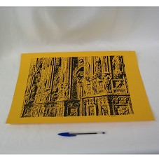 DESENHO (40X29,5 CM) A NANQUIM, SOBRE CARTOLINA LARANJA. RETRATA FACHADA DE UM EDIFÍCIO, QUE LEMBRA UMA IGREJA, COM PÓRTICOS CONTENDO ESTÁTUAS E ESCULTURAS RENASCENTISTAS. NO CANTO INFERIOR DIREITO, 'Mº ENZO NATELLA / 20 VIII 1998'. ATRÁS, 'PARTICOLARE DELLA FACCIATA DEL DUOIO DI MILANO / FOTO BROGI / ENCICLOPEDIA TRECCANI / EDIZIONE 1934 / TAVOLA LXVII / PROF. ELISABETTA BARBIERI'. ACONDICIONADO EM PASTA PLÁSTICA.