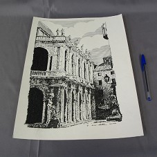 DESENHO (23X38 CM) A NANQUIM, SOBRE CANSON CREME. RETRATA FACHADA DE UMA POSSÍVEL IGREJA, EM DOIS ANDARES, COM PÓRTICOS EM ARCOS PLENOS E ESTATUETAS NA PLATIBANDA DO TELHADO. NO CANTO INFERIOR DIREITO, 'Mº ENZO NATELLA / 16 II 1997'. ACONDICIONADO EM PASTA PLÁSTICA.
