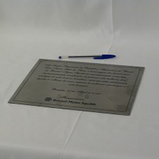 PLACA (28X22 CM) EM METAL PRATEADO ESCOVADO, COM MOLDURA PRETA. POSSUI A INSCRIÇÃO 'AO SENHOR PRESIDENTE DA REPÚBLICA FEDERATIVA DO BRASIL / LUIZ INÁCIO LULA DA SILVA, A HOMENAGEM DOS FUNCIONÁRIOS DA BRISTOL-MYERS SQUIBB EM RECONHECIMENTO À SUA LUTA PERMANENTE PELA ERRADICAÇÃO DA POBREZA E DA MELHORIA DAS CONDIÇÕES DE VIDA DO POVO BRASILEIRO, AÇÕES QUE ESTÃO DIRETAMENTE LIGADAS À MISSÃO DE NOSSA EMPRESA DE MELHORAR E PROLONGAR A VIDA HUMANA. BRASÍLIA, 22 DE ABRIL DE 2005. / FUNCIONÁRIOS BRISTOL-MYERS SQUIBB'. ACONDICIONDA EM ESTOJO FORRADO DE VELUDO AZUL MARINHO.
