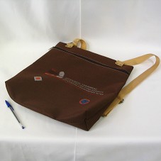 MOCHILA EM NYLON MARROM, COM ALÇAS EM MARROM CLARO, NO MESMO MATERIAL NA FRENTE, ESTAMPA COM A INSCRIÇÃO 'XVI CONGRESSO CONTNENTAL / CIOSL ORIT / JUSTICIA SOCIAL Y SOLIDARIDADE / SOCIAL JUSTICE ANDA GLOBA SOLIDARITY / JUSTIÇA SOCIAL E SOLIDARIEDADE GLOBAL'.