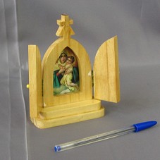 MINI ORATÓRIO EM MADEIRA CLARA (7,5X2,5X12,5 CM) COM UMA CRUZ NO TOPO E PORTAS COM PUXADOR EM MIÇANGA ESFÉRICA AMARELA. NO INTERIOR, IMAGEM DE NOSSA SENHORA SEGURANDO UMA CRIANÇA. FIXADO EM BASE ESCALONADA DE MADEIRA (10X4,5X2 CM).