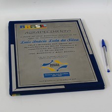 PLACA (20X29,5 CM) EM AÇO ESCOVADO, COM A INSCRIÇÃO 'AGRADECIMENTO / O POVO DE JOSÉ BONIFÁCIO AGRADECE AO EXMO. SR. PRESIDENTE DA REPÚBLICA, LUIZ INÁCIO LULA DA SILVA / PELA LIBERAÇÃO DAS OBRAS DE RECUPERAÇÃO DA MALHA ASFÁLTICA E CONSTRUÇÃO DA TERCEIRA FAIXA DA BR-153 ENTRE JOSÉ BONIFÁCIO E BADY BASSITT. / CELSO OLIMAR CALGARO / PREFEITO DE JOSÉ BONIFÁCIO / ... / JOSÉ BONIFÁCIO, 28 DE ABRIL DE 2005.', POSSUI LOGOMARCA DO GOVERNO FEDERAL E 'MINISTÉRIO DOS TRANSPORTES'. FIXADA EM PASTA ABERTA COBERTA DE VELUDO AZUL MARINHO, COM FITA VERDE E AMARELA NA FRENTE.