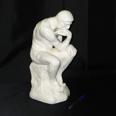 ESCULTURA (13X16X36 CM) EM GESSO, RÉPLICA DE 'O PENSADOR', DE AUGUSTE RODIN, COM PEQUENAS DIFERENÇAS, COMO A MÃO QUE DESCANSA SOBRE A PERNA ESQUERDA, QUE ESTÁ COLOCADA SOBRE O JOELHO, DIFERENTE DO ORIGINAL. NA BASE POSTERIOR, 'MOULAGE DART 268 / PACINI'.