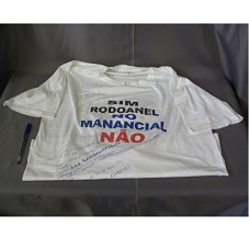 CAMISETA (TAM XG) EM MALHA BRANCA, DE MANGA CURTA. NA FRENTE, 'SIM RODOANEL / NO MANANCIAL NÃO', E ASSINATURAS, EM CANETA ESFEROGRÁFICA. ATRÁS, MESMA INSCRIÇÃO.