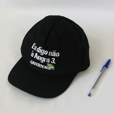 BONÉ EM BRIM PRETO. NA FRENTE, BORDADO EM BRANCO, 'EU DIGO NÃO À ANGRA 3. GREENPEACE', E A BANDEIRA DO BRASIL. ATRÁS, 'WWW.GREENPEACE.ORG.BR'.
