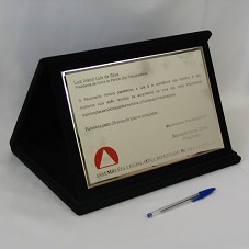 PLACA (30X20 CM) EM AÇO FOSQUEADO, COM BORDAS POLIDAS. POSSUI A INSCRIÇÃO: 'LUIZ INÁCIO LULA DA SILVA / PRESIDENTE DE HONRA DO PARTIDO DOS TRABALHADORES / O PARLAMENTO MINEIRO PARABENIZA A LUTA E A RESISTÊNCIA DOS HOMENS E DAS MULHERES CUJA AÇÃO RESULTOU NO SURGIMENTO DE UMA DAS MAIS IMPORTANTES ORGANIZAÇÕES DA HISTÓRIA POLÍTICA NACIONAL: O PARTIDO DOS TRABALHADORES. PARABÉNS PELOS 25 ANOS DE LUTAS E CONQUISTAS. / BELO HORIZONTE, 15 DE ABRIL DE 2005 / DEPUTADO MAURI TORRES / PRESIDENTE / ASSEMBLÉIA LEGISLATIVA DO ESTADO DE MINAS GERAIS'. FIXADA EM ESTOJO FORRADO DE VELUDO PRETO (36X26X2,5 CM).