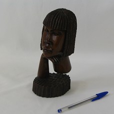 ESCULTURA (8X10X19 CM) EM MADEIRA ESCURA, COM TONALIDADE MARROM-AVERMELHADA. FIGURA DE UM ROSTO FEMININO, MULHER NEGRA, COM QUEIXO APOIADO EM UMA DE SUAS MÃOS. ESCULPIDA EM PEÇA ÚNICA.