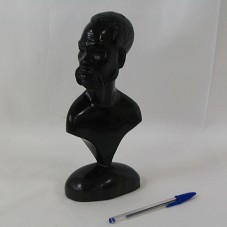 ESCULTURA (12,5X7X25,5 CM) EM ÉBANO. BUSTO COM ROSTO MASCULINO, HOMEM NEGRO, COM ROSTO EM PERFIL, BIGODE E BARBA. ESCULPIDA EM PEÇA ÚNICA.