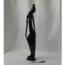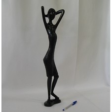 ESCULTURA (13X7X48,5 CM) EM ÉBANO. FIGURA DE UMA MULHER NEGRA, EM PÉ, COM VESTIDO TOMARA-QUE-CAIA, SEGURANDO O CABELO COM AS DUAS MÃOS. ESCULPIDA EM PEÇA ÚNICA.