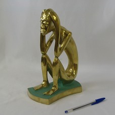ESCULTURA EM BRONZE OXIDADO (8,5X15,5X26 CM), FIGURA DE UM HOMEM NEGRO SENTADO, COM JOELHOS DOBRADOS E PÉS NO CHÃO, COTOVELOS APOIADOS NOS JOELHOS E MÃOS NA CABEÇA. FIXADO EM BASE DE MESMO MATERIAL, COM PARTE SUPERIOR ESVERDEADA.