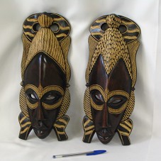 DUAS MÁSCARAS ESCULPIDAS EM MADEIRA (15X5X38 CM), MOSTRANDO ROSTO FEMININO, COM CABELO EM COQUE E LATERAIS ORNAMENTADAS, ENTALHADAS NA MADEIRA, FAZENDO COM QUE ELA FIQUE MAIS CLARA.