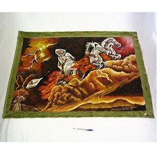 PINTURA (110X80 CM) SOBRE VELUDO VERDE MUSGO. RETRATA A FIGURA DE UM HOMEM DE UM HOMEM VELHO, VESTINDO TÚNICA BRANCA, GUIANDO UMA BIGA (CARRO GRECO-ROMANO) PUXADA POR DOIS CAVALOS BRANCOS, ENTRE NUVENS E CHAMAS. OLHA PARA UMA FOLHA E LÁPIS, QUE CAEM EM DIREÇÃO A UM HOMEM NEGRO. NO CANTO INFERIOR DIREITO, 'BENVINDO PULULU 05'. ATRÁS, 'ATELIER: ANTONIO PULULU / TITULO: ARTE HERDADA / TELEFONE: 923 565689 / LUANDA/ANGOLA'. ACONDICIONADA EM TUBO FORRADO DE NAPA VINHO.