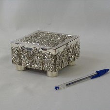 PORTA-JÓIAS (11X11X6,5 CM) EM MADEIRA, REVESTIDO DE PRATA 925. ORNAMENTADO EXTERNAMENTE COM FIGURAS QUE REPRESENTAM, NA LATERAL, O CETRO DO PODER SENDO PASSADO DE DE MÃO EM MÃO POR CADA UM DOS REIS; OS HIERÓGLIFOS, NA TAMPA, NARRAM A FUNDAÇÃO DA CIDADE, EM 06/09 DO ANO 426 D.C.. É A REPRESENTAÇÃO DO 'ALTAR Q', ESCULTURA MONOLÍTICA, QUE LEGITIMOU O PODERIO DO REI YAX KUK MO, ATRAVÉS DO SEU RETRATO E DE CADA UM DOS ANTECESSORES DE SUA DINASTIA. NO INTERIOR DO OBJETO, PLACA COM A INSCRIÇÃO 'RICARDO MADURO / PRESIDENTE DE LA REPBULICA DE HONDURAS'. ACOMPANHA FOLHETO COM SIGNIFICADO DA PEÇA. ACONDICIONADO EM CAIXA FORRADA COM PAPEL RECICLADO, NA COR VINHO E CREME.
