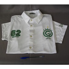 DUAS CAMISAS (TAM M) EM MALHA BRANCA, DE MANGA CURTA, BOTÃO NA FRENTE E GOLA PÓLO. CAMISAS EM COMEMORAÇÃO AOS '62 ANOS' DO 'GOIÁS ESPORTE CLUBE'. NA FRENTE, ESTAMPA EM VERDE, '62 ANOS' E SÍMBOLO DO TIME, COM A INSCRIÇÃO 'SÓCIO' NA PARTE INFERIOR. ATRÁS, UMA BOLA DE FUTEBOL COM O NÚMERO '62' DENTRO. NA MANGA, BORDADO EM VERDE, 'TICBY'.