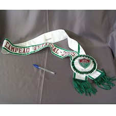 FAIXA COMEMORATIVA DE 'CAMPEÃO ESTADUAL 2005', DO FLUMINENSE FUTEBOL CLUBE, BRANCA COM DETALHES NAS CORES DO TIME.