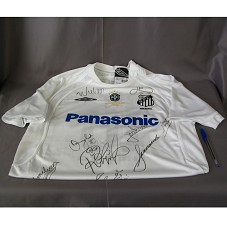 CAMISA DE FUTEBOL OFICIAL (TAM M) DO SANTOS FUTEBOL CLUBE, NÚMERO '10', COM A INSCRIÇÃO 'BIMUNDIAL' ABAIXO DO BRASÃO DO TIME, AUTOGRAFADA PELOS JOGADORES.