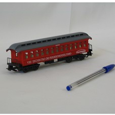 FERREOMODELISMO, VAGÃO (17X3X5 CM) DE UM TREM, PARA TRANSPORTE DE PESSOAS, NA COR VERMELHA, COM TETO CINZA, POSSUINDO A INSCRIÇÃO 'VIII ENCONTRO DE FERREOMODELISMO / FRATESCH'. ARCONDICIONADO EM EMBALAGEM PRÓPRIA, COM LOGOMARCA DO FABRICANTE.