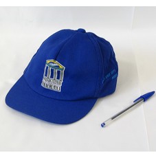 BONÉ EM TECIDO AZUL. NA FRENTE, ESTAMPA MOSTRANDO UM PÓRTICO GRECO-ROMANO, COM FRONTÃO COM DESENHO ESTILIZADO DA BANDEIRA DO BRASIL, TENDO AO CENTRO, TRILHOS FÉRREOS; ABAIXO, A INSCRIÇÃO 'PONTO DE CULTURA BARÃO DE MAUÁ'. NAS LATERAIS, 'NOSSO AMOR CORRE NESSES TRILHOS / FUNDO NACIONAL DE CULTURA / MINISTÉRIO DA CULTURA'.