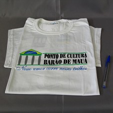 CAMISETA (TAM GG), EM MALHA BRANCA, DE MANGA CURTA. NA FRENTE, ESTAMPA MOSTRANDO UM PÓRTICO GRECO-ROMANO, COM FRONTÃO COM DESENHO ESTILIZADO DA BANDEIRA DO BRASIL, TENDO AO CENTRO, TRILHOS FÉRREOS; E A INSCRIÇÃO 'PONTO DE CULTURA BARÃO DE MAUÁ / NOSSO AMOR CORRE NESSES TRILHOS'. ATRÁS, MESMA ESTAMPA EM TAMANHO MENOR E 'FUNDO NACIONAL DE CULTURA / MINISTÉRIO DA CULTURA'.