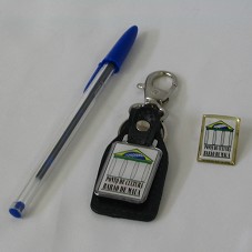 BÓTON EM METAL DOURADO (2X2,7 CM), TENDO NA FRENTE, DESENHO MOSTRANDO UM PÓRTICO GRECO-ROMANO, COM FRONTÃO COM DESENHO ESTILIZADO DA BANDEIRA DO BRASIL, TENDO AO CENTRO, TRILHOS FÉRREOS; ABAIXO, A INSCRIÇÃO 'PONTO DE CULTURA BARÃO DE MAUÁ'. CHAVEIRO (11 CM) EM COURO PRETO, COM MEDALHA RETANGULAR EM METAL PRATEADO, POSSUINDO MESMO DESENHO E INSCRIÇÃO.
