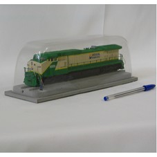 FERREOMODELISMO, LOCOMOTIVA (24,5X4X6 CM) PINTADA DE VERDE E BEGE, COM A INSCRIÇÃO '9005 / BRASIL FERROVIAS'. POSSUI O BONECO DO MAQUINISTA NA LATERAL DIRETA DELA, EM PÉ, DO LADO EXTERNO DA LOCOMOTIVA. FIXADA EM BASE (8X28X2 CM) DE MADEIRA PINTADA DE CINZA, E, PROTEGIDA POR REDOMA DE PLÁSTICO.