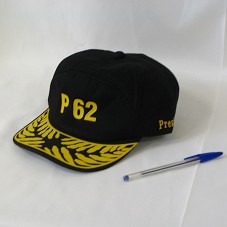 BONÉ EM BRIM PRETO, ACOLCHOADO INTERNAMENTE. NA FRENTE, ESTAMPA EM AMARELO, 'P 62'. NAS LATERAIS, 'PRESIDENTE' E DESENHO DE UM NAVIO. POSSUI ABA COM DESENHOS AMARELOS.