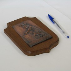 ESCULTURA (8,5X13 CM) BIDIMENSIONAL EM COBRE, MOSTRANDO UM HOMEM COM MARTELO NA MÃO, CUNHANDO MOEDA. POSSUI A INSCRIÇÃO 'MOEDEIRO DO SÉCULO XVII / CASA DA MOEDA DO BRASIL'. FIXADA EM BASE (13,5X20,5X1,5 CM) DE MADEIRA, COM FORMATO DE UM BRASÃO. ACONDICIONADA EM ESTOJO DE COURO PRETO.