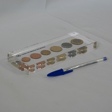 PLACA EM ACRÍLICO (19X7X2 CM), ONDE ESTÃO INCRUSTADAS AS CINCO MOEDAS DE CENTAVOS DE REAL E A MOEDA DE UM REAL. POSSUI A INSCRIÇÃO, EM AZUL, NA PARTE SUPERIOR ESQUERDA, 'CASA DA MOEDA DO BRASIL' E LOGOMARCA. ACONDICIONADA EM SACO DE VELUDO AZUL MARINHO.