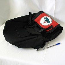 MOCHILA EM LONA PRETA, COM BOLSO FRONTAL. NA FRENTE, ESTAMPA COM SÍMBOLO DO MOVIMENTO DOS TRABALHADORES RURAIS SEM TERRA - MST.