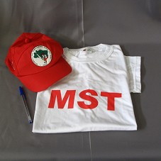 CAMISETA (TAM G) EM MALHA BRANCA, DE MANGA CURTA. NA FRENTE, EM VERMELHO, 'MST'. ATRÁS, 'MARCHA NACIONAL PELA REFORMA AGRÁRIA / 1º A 17 DE MAIO/2005'. BONÉ EM BRIM VERMELHO, COM SÍMBOLO DO 'MST' NA FRENTE, E MESMA INSCRIÇÃO NAS LATERAIS.