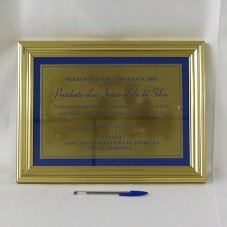 PRÊMIO PERSONALIDADE CIDADANIA 2005. PLACA (30X20 CM) EM METAL DOURADO, COM GRAVAÇÃO EM AZUL, 'PERSONALIDADE CIDADANIA 2005 / PRESIDENTE LUIZ INÁCIO LULA DA SILVA / ELEITO EM VOTAÇÃO DIRETA PELA COMUNIDADE POR SUA GRANDE CONTRIBUIÇÃO AO DESENVOLVIMENTO SOCIAL E À CIDADANIA. / RIO DE JANEIRO, 5 DE MAIO DE 2005 / UNESCO / ASSOCIAÇÃO BRASILEIRA DE IMPRENSA / FOLHA DIRIGIDA'. POSSUI MOLDURA (40X30 CM) DOURADA E PASSE-PARTOUT EM VELUDO AZUL. ACONDICIONADA EM ESTOJO FORRADO DE LYCRA AZUL ROYAL.