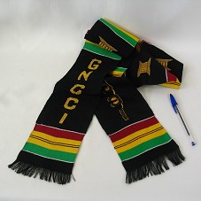 FAIXA (172 CM) EM TECIDO PRETO, COM LISTRAS HORIZONTAIS NAS CORES VINHO, AMARELO E VERDE, E DETALHES EM AMARELO-DOURADO IMITANDO UM CAPITÓLIO. NAS DUAS EXTREMIDADES, A INSCRIÇÃO 'GNCCI'.