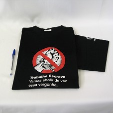DUAS CAMISETAS (TAM G) EM MALHA PRETA, DE MANGA CURTA. NA FRENTE, EM VERMELHO E BRANCO, 'TRABALHO ESCRAVO / VAMOS ABOLIR DE VEZ ESSA VERGONHA.', E ESTAMPA COM UMA MÃO ACORRENTADA, DENTRO DO SÍMBOLO DE PROIBIDO.
