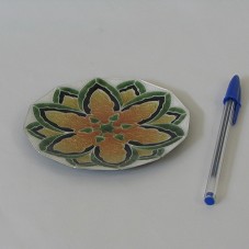 CONJUNTO COM CINCO PIRES (11,5 CM DE DIÂMETRO, CADA) EM METAL PRATEADO, BORDA EM DOZE FACES, TRABALHADO EM ESMALTE-CLOISONNÈ, COM DESENHO DE UMA FLOR, EM VERDE, PRETO E TONALIDADES DE DOURADO. FUNDO POSTERIOR PINTADO DE PRETO, COM ETIQUETA 'ANDO CLOISONNE'. ACONDICIONADO EM CAIXA PRATEADA. ACOMPANHA INFORMATIVO SOBRE A PEÇA.