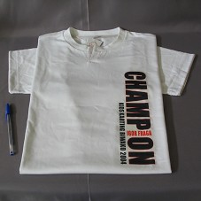 CAMISETA (TAM XG) EM MALHA BRANCA, DE MANGA CURTA, COM DETALHES EM BEGE NAS MANGAS E NA GOLA. NA FRENTE, 'CHAMPION KIDS KARTING BIWAKO 2004 / IGOR FRAGA'. ATRÁS, ESTAMPA COM DESENHO DE UM MENINO VESTIDO COM UNIFORME DE KART, AO LADO DE UM CARRO DE CORRIDA.