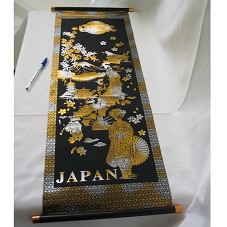 PAINEL (28,5X81 CM), EM TECIDO PRETO, TIPO BANNER, COM ESTAMPA, EM DOURADO E PRATEADO, MOSTRANDO O MAPA DO JAPÃO, COM NOMES DAS CIDADES E DESENHOS AS CARATERIZANDO. NA PARTE INFERIOR, 'JAPAN'.