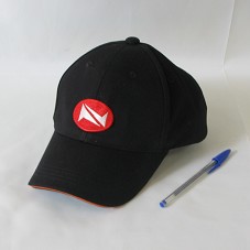 BONÉ EM BRIM PRETO PRETO COM DETALHE VERMELHO NA ABA. NA FRENTE, SÍMBOLO BORDADO EM VERMELHO E BRANCO.