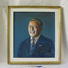 PINTURA SOBRE TELA (47,5X53 CM), RETRATANDO O BUSTO DO PRESIDENTE LUIZ INÁCIO LULA DA SILVA. PREDOMINA OS TONS DE AZUL. NO CANTO INFERIOR DIREITO, '13-2-05 / ERWIN'. MOLDURA (60,5X66 CM) EM MADEIRA PINTADA DE DOURADO COM PASSE-PARTOUT BEGE. ATRÁS, 'ARTISTA: ERWIN DE VRIES / ANTON DRAGTEN WEG 260 / PARAMARIBO / SURINAME / TEL + FAX 453839 - 00579 / PRESENT FOR THE PRESIDENT OF BRAZIL 16-5-05'.