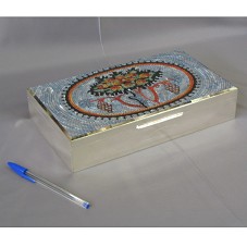PORTA-JÓIA (28x16x5,5 CM) EM PRATA 925, REVESTIDO INTERNAMENTE EM MADEIRA. POSSUI TAMPA TRABALHADA EM MOSAICO DE MADREPÉROLA, COM DESENHO DE UMA ÁRVORE, EM TONS DE PRATA MULTICOR, PRETO, LARANJA E VERDE. NA FRENTE, ASSINATURA GRAVADA. NO FUNDO EXTERNO, '3/200'. ACONDICIONADA EM CAIXA (34,5X23X8 CM) FORRADA DE NAPA VINHO, COM SÍMBOLO DE UMA COROA NA TAMPA.