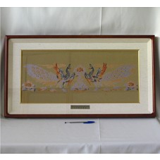 QUADRO (78X43 CM) COM MOLDURA EM MADEIRA, TIPO CAIXOTE, TAMPO DE VIDRO E PASSE-PARTOUT BEGE COM FRISO DOURADO. EMOLDURA ESTAMPA BORDADA EM TECIDO MARROM DOURADO, MOSTRANDO DOIS PAVÕES DE FRENTE UM PARA O OUTRO, COM FLORES ENTRE ELES. PREDOMINA OS TONS DE AZUL, LARANJA E VERMELHO. NO CENTRO INFERIOR, PLACA COM A INSCRIÇÃO 'THE HOUSE OF COUNCILLORS, JAPAN'. ACONDICIONADO EM CAIXA DE PAPELÃO.