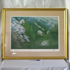 QUADRO (88X69,5 CM) COM MOLDURA DOURADA, TAMPO DE VIDRO E PASSE-PARTOUT EM TECIDO BEGE. EMOLDURA PINTURA AQUARELADA (65X44,5 CM) RETRATANDO UM VALE, POR ONDE PASSA UM RIACHO, COM UMA CASA AO FUNDO. PREDOMINA OS TONS DE VERDE, BRANCO E ROSA. NO CANTO INFERIOR ESQUERDO, '4/150'; NO DIREITO, ASSINATURA DO ARTISTA (ILEGÍVEL) E CARIMBO VERMELHO. ATRÁS, FOLHETO COLADO, COM INSCRIÇÕES JAPONESAS. ACONDICIONADO EM CAIXA DE PAPELÃO, EM TONS DE MARROM.