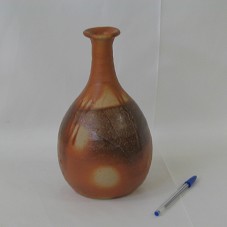JARRO EM CERÂMICA (13,5X13,5X23,9 CM) COM BOJO ABAULADO E GARGALO MAIS ESTREITO. POSSUI PINTURA DISFORME EM TONS DE MARROM, ESCURECENDO NA PARTE DO BOJO. ACONDICIONADO EM CAIXA DE MADEIRA CLARA (16,8X16,8X29,3 CM), COM IDEOGRAMAS JAPONESES NA FRENTE. ACOMPANHA CARTÃO DE VISITA DO REMETENTE.