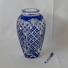 JARRO (15X15X26 CM) EM CRISTAL, TRANSPARENTE E AZUL, COM BOJO MAIOR NA PARTE SUPERIOR, AFINANDO NA BASE E NA BOCA. TRABALHADO COM MOTIVOS DIVERSOS, EM BAIXO RELEVO. POSSUI SELO DO FABRICANTE 'KAGAMI CRYSTAL / MADE IN JAPAN'. ACOMPANHA DOIS FOLHETOS, UM EM INGLÊS, OUTRO EM JAPONÊS. ACONDICIONADO EM ESTOJO AZUL MARINHO, COM IDEOGRAMAS JAPONESES NA TAMPA.