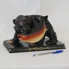 ESCULTURA EM MADEIRA (23X17X13 CM), FIGURA DE UM URSO COM UM PEIXE NA BOCA. ACOMPANHA BASE (27X15,5X2 CM) EM MADEIRA PINTADA DE PRETO, COM DETALHE ENTALHADO NA FRENTE. ACONDICIONADOS, SEPARADAMENTE, EM CAIXAS DE PAPELÃO.