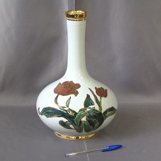 JARRO (19,5X19,5X33 CM) EM PORCELANA BRANCA-ACINZENTADA, COM BOJO BAIXO E ARREDONDADO, E GARGALO COMPRIDO. POSSUI PINTURA DE FLORES, COM DETALHES EM DOURADO. ACONDICIONADO EM CAIXA DE MADEIRA CLARA, COM CARTÃO DE VISITA DO REMETENTE NA TAMPA.