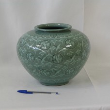 JARRO (25X25X,22 CM) EM CERÂMICA, PINTADA EM TONS DE VERDE, COM DESENHO DE AVES VOANDO, E TEXTURA EM CRAQUELÊ. POSSUI BASE MENOR QUE BOJO SUPERIOR, QUE É MAIS LARGO; E BOCA MAIS ESTREITA. ACONDICIONADO EM CAIXA DE MADEIRA CLARA. ACOMPANHA FOLDER SOBRE A PEÇA E CURRÍCULO DO ARTISTA.