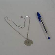 COLAR E PINGENTE EM PRATA. PINGENTE DE FORMATO CIRCULAR, COM EFÍGIE FEMININA, DE PERFIL, USANDO O MESMO COLAR, COM RAMOS DE LÍRIOS A SUA FRENTE. ACOMPANHA INFORMATIVO SOBRE A PEÇA 'A GIRL WITH WHITE LILIES', QUE REPRESENTA UMA DONZELA SEGURANDO RAMOS DE LÍRIOS. ACONDICIONADO EM ESTOJO AVELUDADO NA COR AZUL MARINHO, E ESTE EM CAIXA DE PAPELÃO BRANCO.
