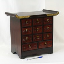 MINI-CÔMODA (31X21,5X36CM) EM MADEIRA AVERMELHADA, COM PUXADORES E DETALHES EM LATÃO. POSSUI ONZE GAVETAS PEQUENAS, E DESTAS, DUAS MAIORES. NA FACE DE CADA GAVETA, IDEOGRAMAS JAPONESES.