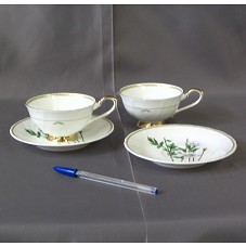 CONJUNTO COM DUAS XÍCARAS E DOIS PIRES, PARA CHÁ, EM PORCELANA BRANCA. PIRES E PARTE INTERNA DA XÍCARA COM PINTURA DE RAMOS DE FLORES VIOLETAS, E DETALHES EM DOURADO. ACOMPANHA CARTÃO DE VISITA DO REMETENTE. ACONDICIONADO EM CAIXA DE PAPELÃO AZUL, COM LOGOMARCA DO FABRICANTE.